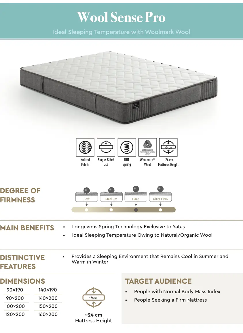 Salteaua Wool Sense Pro de la Yataș Bedding este concepută pentru a oferi un mediu de dormit sănătos, bazat pe proprietățile extraordinare ale materialelor naturale. Suprafața sa include lână Woolmark®, cea mai pură și recunoscută lână la nivel mondial, care are capacitatea de a regla temperatura corpului și de a relaxa ritmul cardiac prin crearea unui microclimat ideal în orice sezon. Structura internă se bazează pe sistemul de arcuri DHT (Double Heat Treated), exclusiv la Yataș Bedding, care constă în arcuri de oțel tratate termic de două ori. Această tehnologie asigură păstrarea formei inițiale a saltelei pentru mulți ani, oferind o susținere fermă și ortopedică ce minimizează întreruperile din timpul somnului. Deși este o saltea cu o singură față, designul său robust și straturile de confort sunt optimizate pentru a preveni lăsarea, asigurând o coloană vertebrală aliniată corect în fiecare noapte.